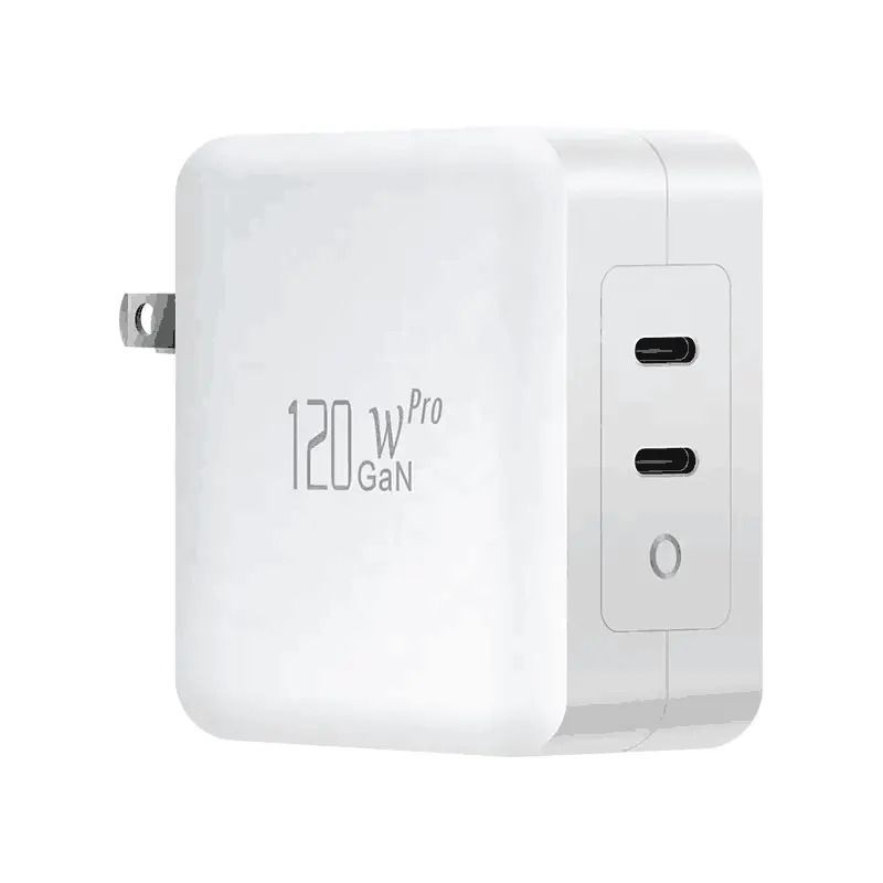 콤팩트한 고속 충전 어댑터, USB-C 포트 2개, 노트북, 태블릿, 기타 전자 기기에 최대 120W의 총 출력을 제공합니다.